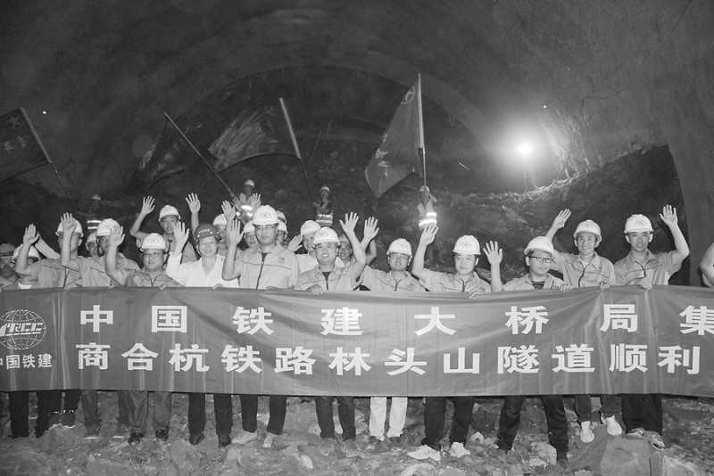含山縣林頭山隧道全長(zhǎng)1432米,是商合杭鐵路中連接漕河特大橋(2572.9米)和廟前特大橋(1151.43米)的重要隧道,為單洞雙線隧道,隧道地質(zhì)較為復(fù)雜,均為Ⅳ級(jí)、Ⅴ級(jí)圍巖。承建方在隧道開(kāi)挖中采用六步CD開(kāi)挖法、三臺(tái)階臨時(shí)仰拱法等工法施工。經(jīng)過(guò)隧道全體參建員工歷時(shí)600多天的艱苦戰(zhàn)斗,針對(duì)工程工期緊、任務(wù)重、征拆難度大的實(shí)際,迎難而上,終于順利貫通,為下一步保鋪架贏得了時(shí)間。圖為林頭山隧道貫通情景。