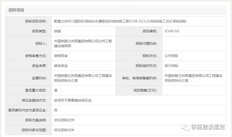 鐵路建設規劃消息:5月20日,《 新建蘭州中川國際機場綜合交通樞紐環線鐵路工程JCHX-SG1/3/4標段施工總價承包招標》正式發布。