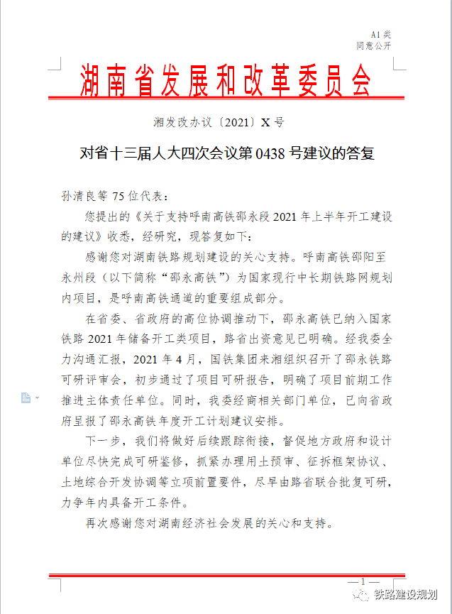 鐵路建設規劃消息:2021年5月,湖南省發展和改革委員會針對《關于支持呼南高鐵邵永段2021年上半年開工建設的建議》(省十三屆人大四次會議第0438號建議)給出了答復,其答復內容如下: