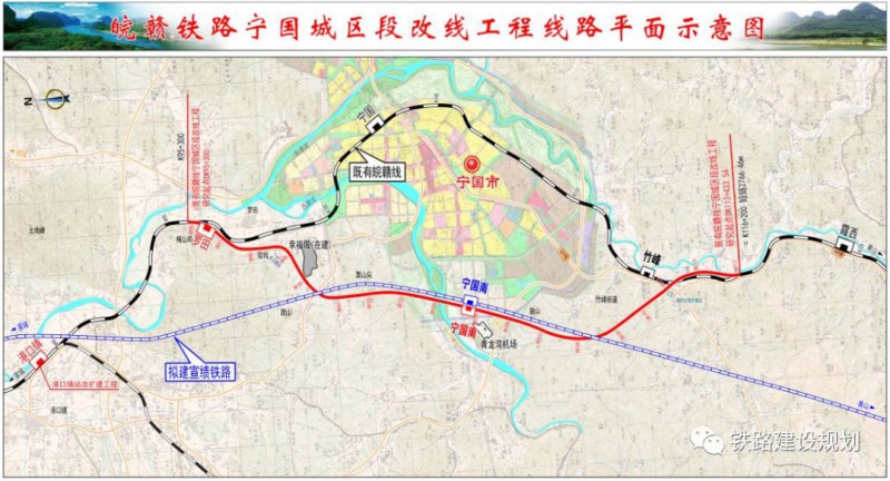 5月11日,《皖贛鐵路寧國城區改線工程施工總價承包招標資格預審公告》發布。改線后線路將外繞至市區西側,線路長度18.13km,廢棄既有線長度20.9km。改建后寧國城區段共分布港口鎮站、羅田站及寧國南站。
