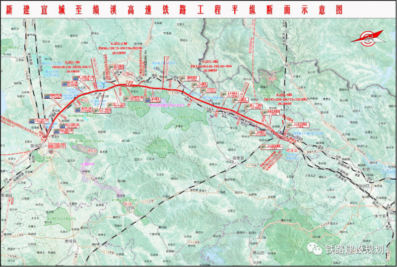 宣績高鐵位于安徽省境內,線路自宣城站引出,向東南經寧國市,再折向南至績溪北站。正線全長111.6公里,設計時速350公里,共設宣城、寧國南、績溪北3座車站,設十里巖線路所1座。