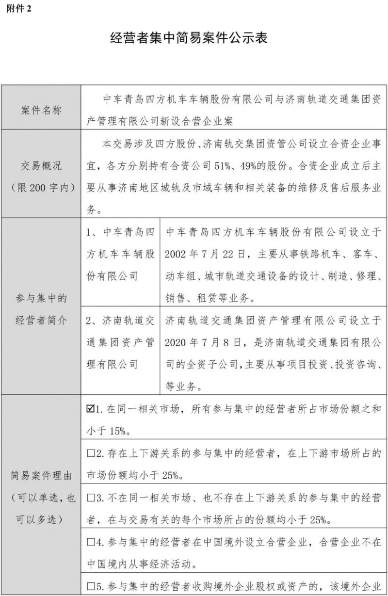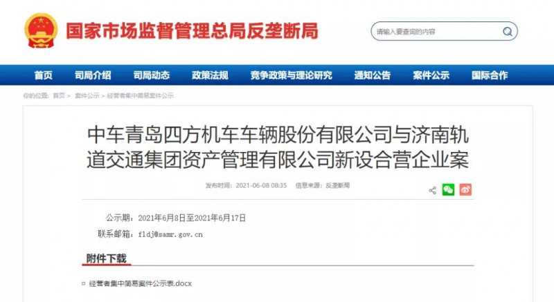 6月8日,國家市場監督管理總局反壟斷局發布《中車青島四方機車車輛股份有限公司與濟南軌道交通集團資產管理有限公司新設合營企業案》。