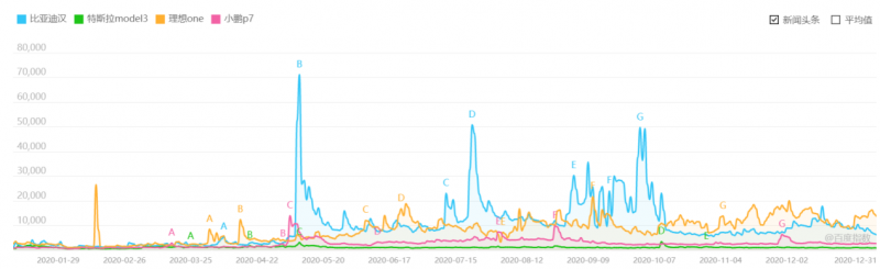 同時,對比比亞迪漢和其他品牌車企的車型熱度,通過2020年的百度指數發現,比亞迪漢的百度搜索指數,在同級別新能源車產品中遙遙領先。