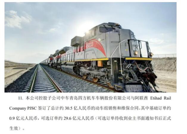 北京時間6月28日,中車發布公告,正式公布2021年3至6月期間簽訂的若干項合同,合計金額總約435.5億元人民幣。其中,引人注目的是中車四方與阿聯酋伊提哈德鐵路公司簽訂了總計約30.5億人民幣的動車組銷售和維保合同。其中基礎訂單約0.9億元人民幣,可選訂單約29.6億元人民幣(可選訂單待收到業主書面通知書后正式生效)。
