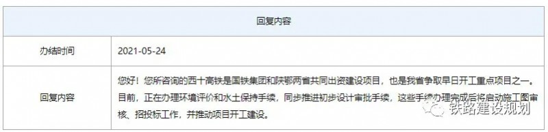 1、西十高鐵是國鐵集團和陜鄂兩省共同出資建設項目,也是我省爭取早日開工重點項目之一。目前,正在辦理環境評價和水土保持手續,同步推進初步設計審批手續,這些手續辦理完成后將啟動施工圖審核、招投標工作,并推動項目開工建設。
