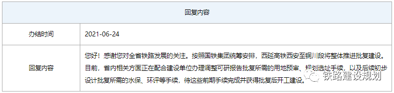 3、按照國鐵集團統籌安排,西延高鐵西安至銅川段將整體推進批復建設。目前,省內相關方面正在配合建設單位辦理調整可研報告批復所需的用地預審、規劃選址手續,以及后續初步設計批復所需的水保、環評等手續,待這些前期手續完成并獲得批復后開工建設。