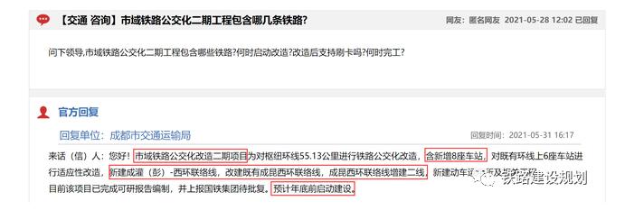 根據成都市交通運輸局回復,市域鐵路公交化改造二期項目為對樞紐環線55.13公里進行鐵路公交化改造,含新增8座車站,對既有環線上6座車站進行適應性改造,新建成灌(彭)-西環聯絡線,改建既有成昆西環聯絡線,成昆西環聯絡線增建二線,新建動車運用所及相關工程。