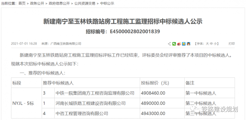 7月1日,《新建南寧至玉林鐵路站房工程施工監理招標中標候選人公示》在廣西交通運輸廳網站發布。各站建設規模確定,項目站房工程即將全面開工建設。