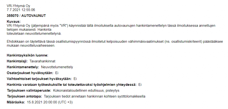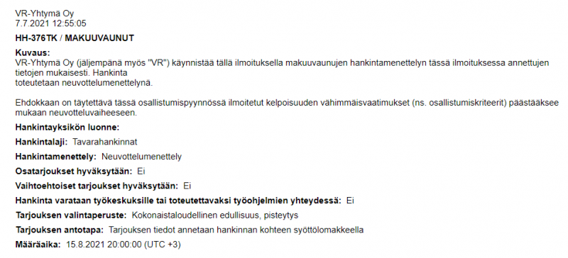 2021年2月,芬蘭鐵路公司正式啟動流程,發出招標邀請,將通過協商程序采購全新動車組列車。候選人必須符合招標文件(征集意向書中)規定的最低資格標準,才可進入談判階段。