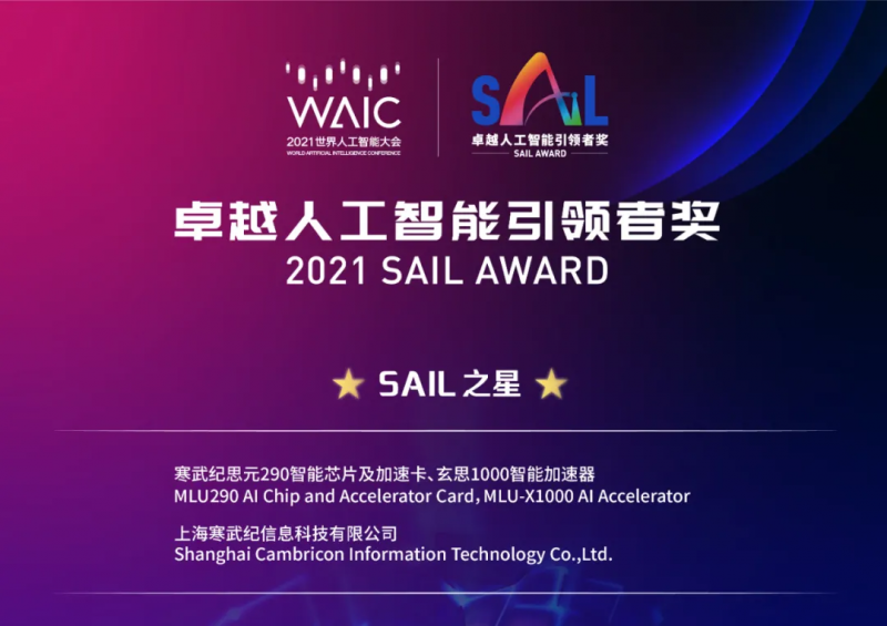 值得一提的是,世界人工智能大會組委會還發(fā)布了2021年度SAIL獎榜單,寒武紀(jì)憑借“寒武紀(jì)思元290智能芯片及加速卡、玄思1000智能加速器”,從眾多參評項目中脫穎而出,斬獲SAIL之星大獎。