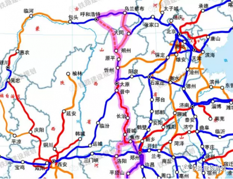 新建呼和浩特經朔州至太原高速鐵路,北起呼和浩特樞紐規劃呼鄂城際黃合少站,經朔州市右玉縣、平魯區,終點引入在建集大原高鐵朔州東站。新建線路全長170.15km( 山西境內99. 9km),設計時速350km/h。新建車站3座,估算投資247.7億元(山西段131.8億元),工期4年。