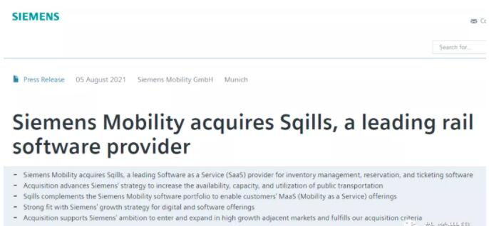 西門子通過近期對于Sqills的收購,交通業務增強了其軟件產品組合,以賦能客戶的“交通即服務”業務。Sqills基于云的可擴展平臺使得鐵路和公交運營商可以引入包含庫存管理、預訂和票務軟件的在線預訂系統。此次收購將幫助交通業務向一個快速增長的關聯市場進行擴張。借助西門子的全球業務布局,軟件即服務(SaaS)業務模式能提供具有較高利潤率和協同潛力的可持續經常性收入。與Hacon、eos.uptrade、Bytemark和Padam Mobility一起,Sqills的S3 Passenger將成為互聯軟件產品組合的一部分,將把各種不同的公共交通服務集合在一起。