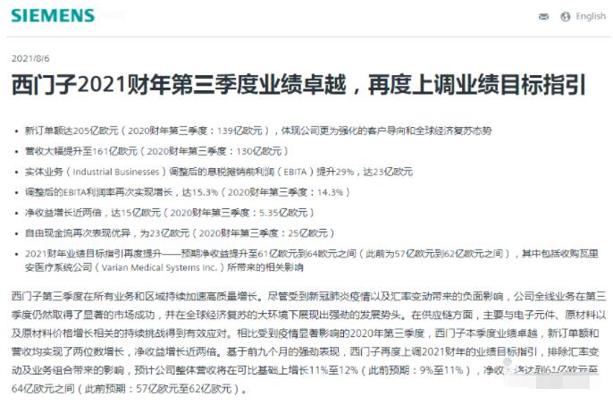 西門子第三季度在所有業務和區域持續加速高質量增長