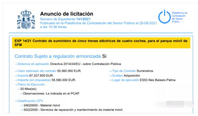 當地時間8月29日,西班牙帕爾米鐵路公司發布全新招標信息,邀請列車制造商參與競爭,以提供5列4車編組動車組及維保服務,項目總價值達到5556萬歐元。