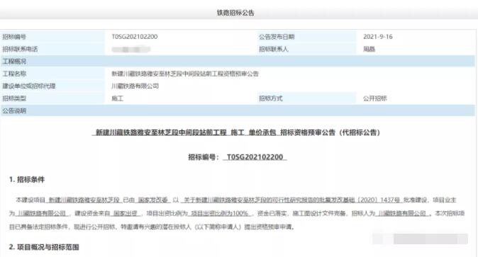 本建設項目新建川藏鐵路雅安至林芝段已由國家發改委以《關于新建川藏鐵路雅安至林芝段的可行性研究報告的批復》(發改基礎〔2020〕1437號)批準建設,項目業主為川藏鐵路有限公司,建設資金來自國家出資,項目出資比例為項目出資比例為100%,資金已落實,施工圖設計文件完備,招標人為川藏鐵路有限公司。本次招標項目已具備法定招標條件,現進行公開招標,特邀請有興趣的潛在投標人(以下簡稱申請人)提出資格預審申請。