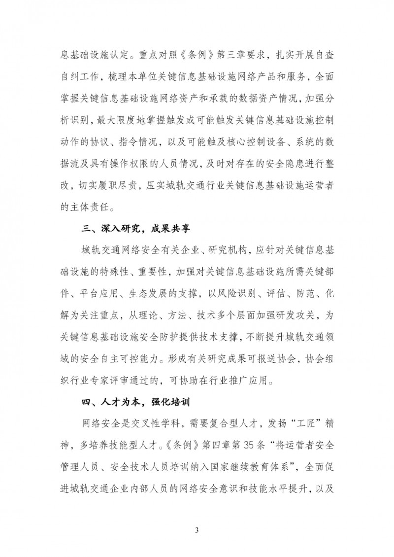 為貫徹落實《條例》規定的相關要求,強化城軌交通行業關鍵信息基礎設施安全保護,城市軌道交通協會(以下簡稱“協會”)圍繞“深入貫徹《條例》規定 筑牢網絡安全屏障”主題發出倡議,在會員單位范圍內組織開展學習、自查自糾和專題培訓工作,具體內容如下: