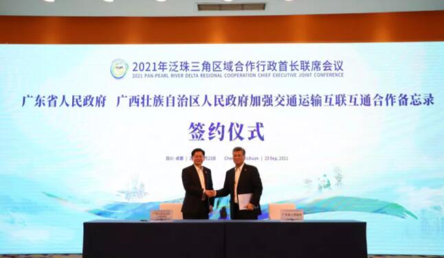 廣東省省長馬興瑞、廣西壯族自治區主席藍天立出席會議,并代表雙方簽署兩省區加強交通運輸互聯互通合作備忘錄。廣東省常務副省長林克慶、廣西壯族自治區常務副主席秦如培以及兩省區有關部門負責人參加會議。