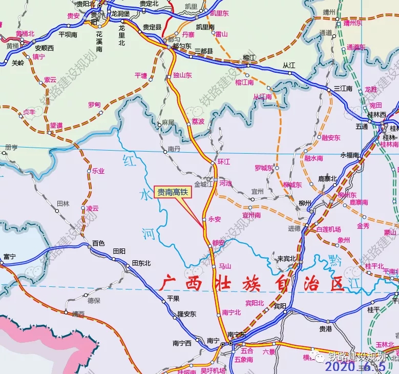 新建貴陽至南寧鐵路北起貴陽樞紐龍里北站,經貴州省都勻、獨山、荔波和廣西壯族自治區環江、金城江、都安、馬山、武鳴至南寧樞紐南寧東站,新建正線全長482公里(其中廣西段正線長度282公里),設計速度目標值為350公里/小時,建設工期6年。
