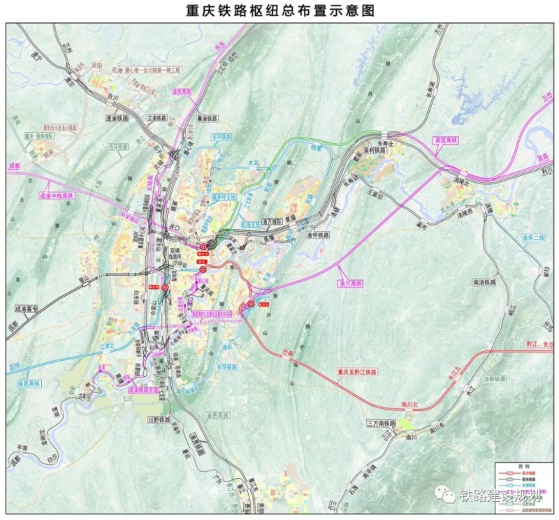 在國家《中長期鐵路網規劃》規劃的“八縱八橫”高速鐵路主通道中,京昆、包(銀)海、蘭(西)廣3縱主通道和沿江、廈渝2橫主通道在重慶交匯。國家通道涉及的渝鄭高鐵、渝昆高鐵、渝西高鐵、渝貴高鐵、成渝高鐵、渝湘高鐵、成渝中線等已列入國家鐵路網中長期規劃,再加上重慶市規劃的成蘭渝高鐵、渝桂高鐵等,總體上形成對外 8 個方向的“米”字型高鐵網。