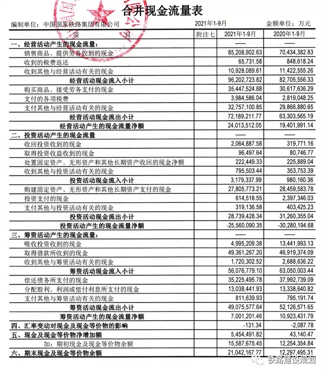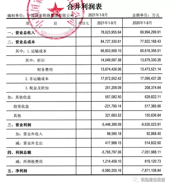 近日,國家鐵路集團有限公司(以下簡稱國鐵集團)披露了2021年前三季度財務決算。今年前三季度,國鐵集團實現收入7862億元,同比增加863億元;凈利潤虧損698億元,同比減虧89億元;全國鐵路固定資產投資完成5101.7億元,投產新線1611公里,其中高鐵610公里,鐵路發展呈現穩中向好態勢,保障民生和服務國家戰略作用凸顯。