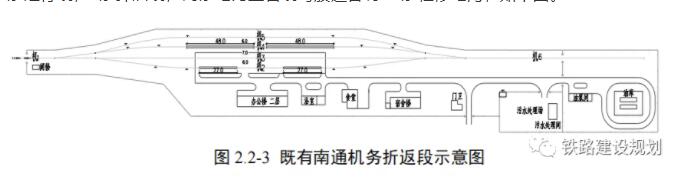 既有南通折返段折返段內設有 1 條出入段線,2 條電力機車整備線、2 條內燃機車整備線,1條走行線,1條卸油線,兩條電力整備線每股道各有 2 條檢修地溝,如下圖。