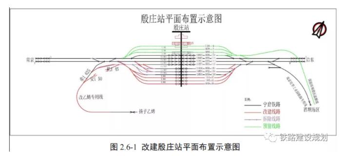 殷莊站改建工程含乙烯專用線改建工程,改乙烯專用線工程自長蘆街道 G205 西側既有乙烯專用線引出,繞避排葛村后折向北,利用寧啟鐵路廢棄路基引入殷莊站牽出線,繼而引入殷莊站。區間新建新路長度 2.575km(單線)。