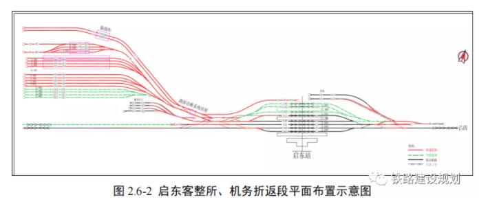 滬渝蓉高鐵引入南通站后,南通站既有客整所及機務折返段還建至啟東站。啟東客車整備所及機務折返段位于啟東站南通端站房對側,設 2 條出入段線,新建存車線 3 條(預留 4 條),車底停留線 2 條,整備庫線 4條,不落輪鏇線、臨修線各 1條,庫前庫后有效長均不小于 510m。