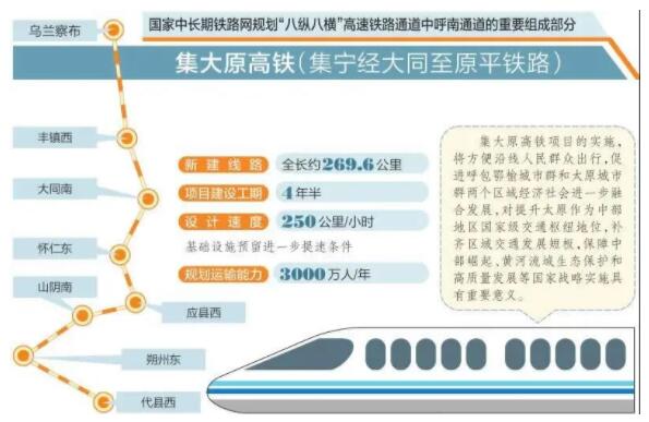 新建集寧經大同至原平鐵路(簡稱集大原鐵路)自內蒙古烏蘭察布站引出,沿途經過山西大同、朔州、忻州市,終點與大西高鐵貫通。