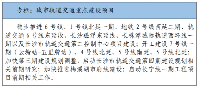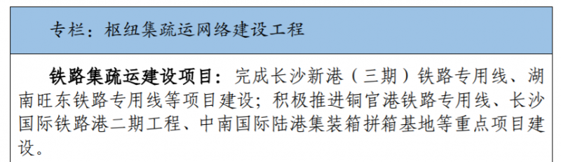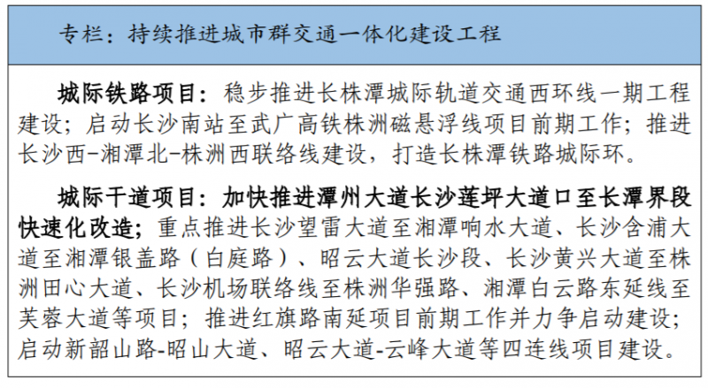 “十四五”期,重點推進渝長廈高速鐵路常益長段、渝長廈高速鐵路長贛段等高速鐵路建設項目,建設里程約153公里,總投資約305億元;重點推進寧鄉-韶山高速公路、江背-干杉高速公路、G4京港澳高速長沙廣福至株洲王拾萬段擴容工程(長沙段)、G4京港澳高速岳陽龍灣至長沙廣福段擴容工程(長沙段)等項目建設,總投資約187億元。