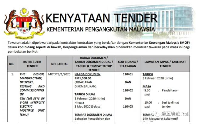 2020年1月,馬來亞鐵道公司發(fā)布招標信息,將采購10列全新列車。