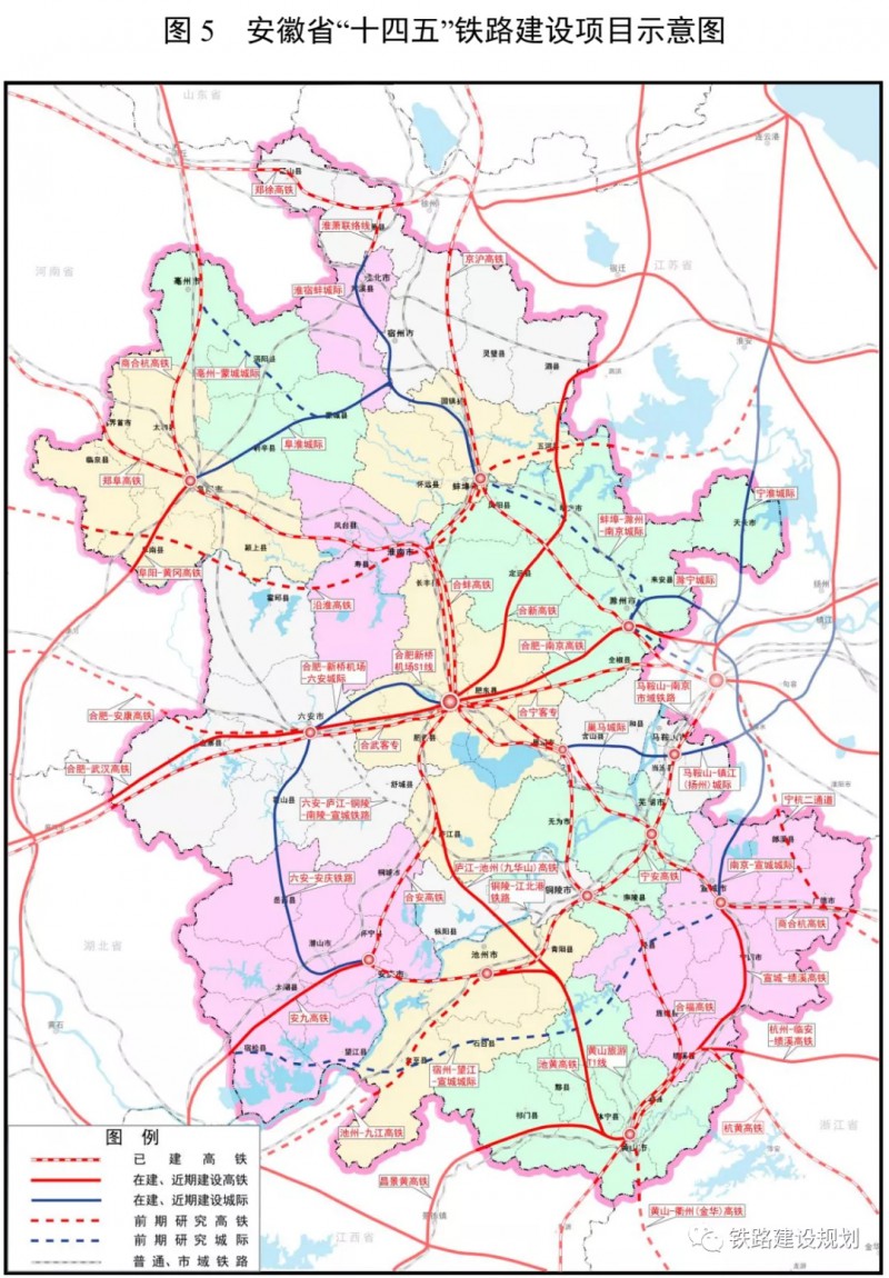 大力推進沿江高鐵武漢至合肥至上海段、合新高鐵,滁寧、揚馬城際鐵路,寧馬、寧天市域鐵路等重點項目建設,完善跨區域快速通道體系,構建服務城市群、都市圈的軌道交通通勤網絡,建設新合肥西站、蕪湖站、滁州站、安慶西、阜陽西、黃山北等綜合樞紐,加快形成干線鐵路、城際鐵路、市域(郊)鐵路、城市軌道交通多層次、優銜接、高品質的軌道交通系統。