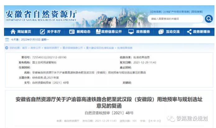 安徽省自然資源廳消息:12月29日,《安徽省自然資源廳關于滬渝蓉高速鐵路合肥至武漢段(安徽段)用地預審與規劃選址意見的復函》正式印發,標志著沿江高鐵合肥至武漢段用地預審與規劃選址正式獲批,為項目可研批復奠定了基礎。