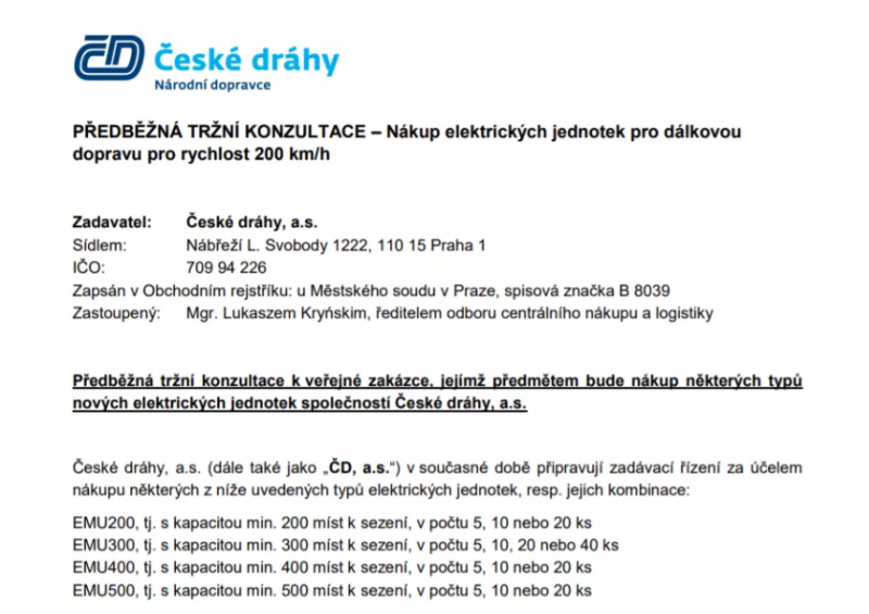 2022年1月,捷克國家鐵路公司發布招標信息,邀請列車制造商參與初步市場咨詢,以采購多類型長途EMU動車組(時速200公里),最多采購數量可達100列。目前,共有11家受邀參與競標,中車位于其中。本次受邀參與,是中車近年來在歐盟市場內首次受邀參與動車組參與競標。 采購車型信息