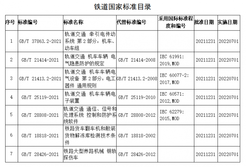 近日,由國家鐵路局組織編制的《軌道交通 牽引電傳動系統 第2部分:機車、動車組》等7項鐵道國家標準,經國家標準化管理委員會審批后正式發布。7項標準中新制定1項,修訂6項,將于2022年7月1日實施。該7項標準是鐵路技術標準體系的重要組成部分,其發布為鐵路產品的設計、制造、檢驗等提供了技術依據,對保障鐵路運營安全和提高產品質量將起到積極的作用。