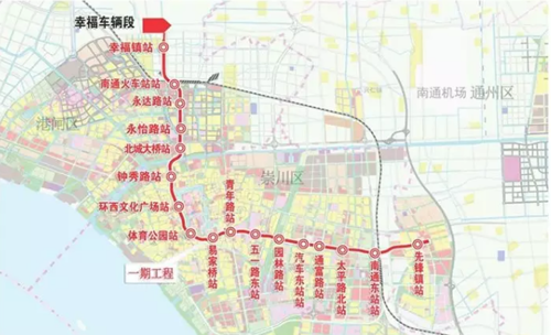 南通軌道交通2號線線路整體走向呈L型,與軌交1號線交叉,呈不標準X型。沿線共設置17座站點,起于港閘幸福,終于通州先鋒。從幸福起點站出發后,經幸福大道→南通火車站→北大街→濠西路→躍龍路→青年中路→青年東路→進入先鋒鎮,線路總長約20.85公里,均為地下線,設幸福車輛段1處,與1號線共用崇川路控制中心。按照實際流量需求,初步設計新增加了北城大橋站,進一步優化華強城、探險王國周邊交通配置。此外按照初步設計,施工過程中,易家橋可能臨時拆除,并調整周邊交通。
