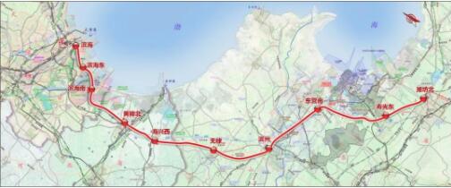 津濰高鐵線路起自京津城際鐵路延伸線濱海站,經天津市濱海新區、河北省滄州市、山東省濱州市、東營市、濰坊市,終至濟青高速鐵路濰坊北站,全長約348.9公里,設站10座。