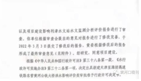3月7日,水利部黃河水利委員會下發《新建天津至濰坊高速鐵路東營黃河公鐵大橋建設項目洪水影響評價類審批準予行政許可決定書》。決定書指出,黃委于2022年1月5日組織召開會議,分別對新建天津至濰坊高速鐵路東營黃河公鐵大橋建設項目暨防洪評價報告,以及項目建設影響利津水文站水文監測分析評價報告進行了審查。