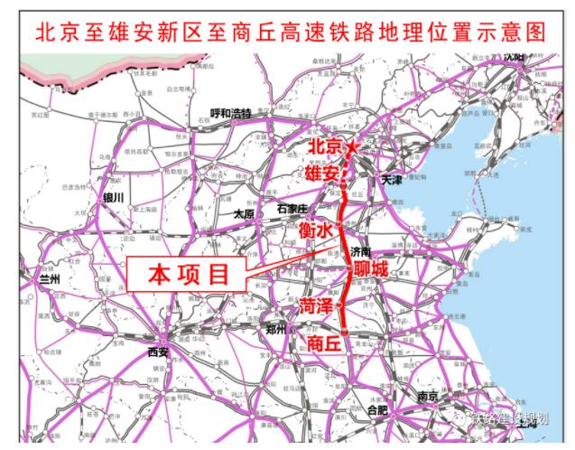 線路北起京雄城際雄安站,向南經河北省雄安新區、滄州市、衡水市、邢臺市進入山東省,終至河南商丘市至商合杭鐵路商丘站,全長552.5公里,估算投資827.1億元,其中河北省境內257.7公里,投資約374億元,設計時速350km/h。該項目由國鐵集團、河北省、山東省、河南省共同出資建設。