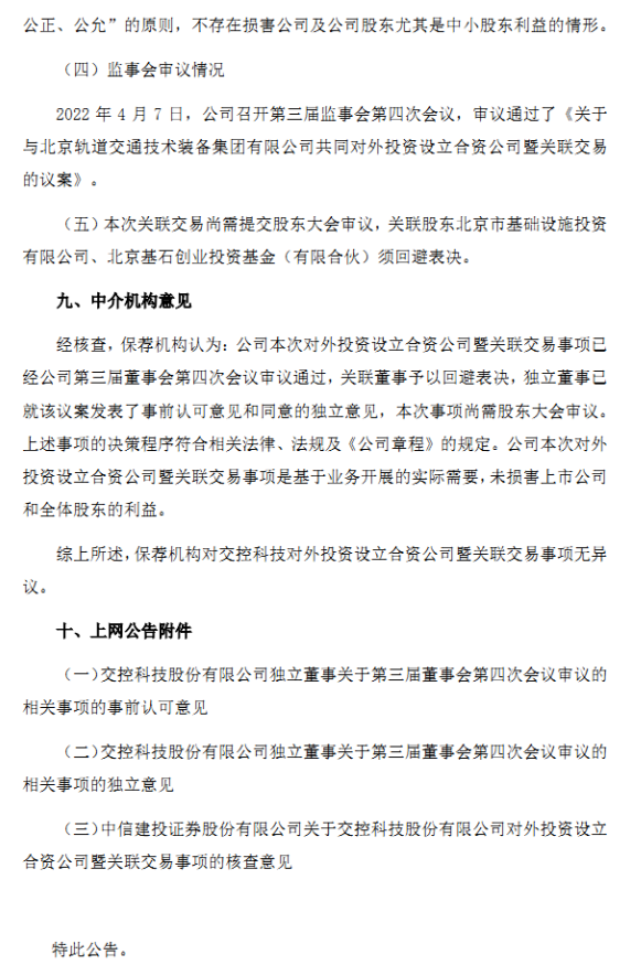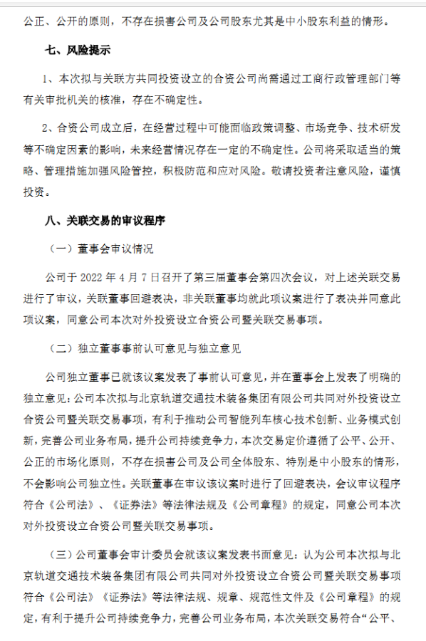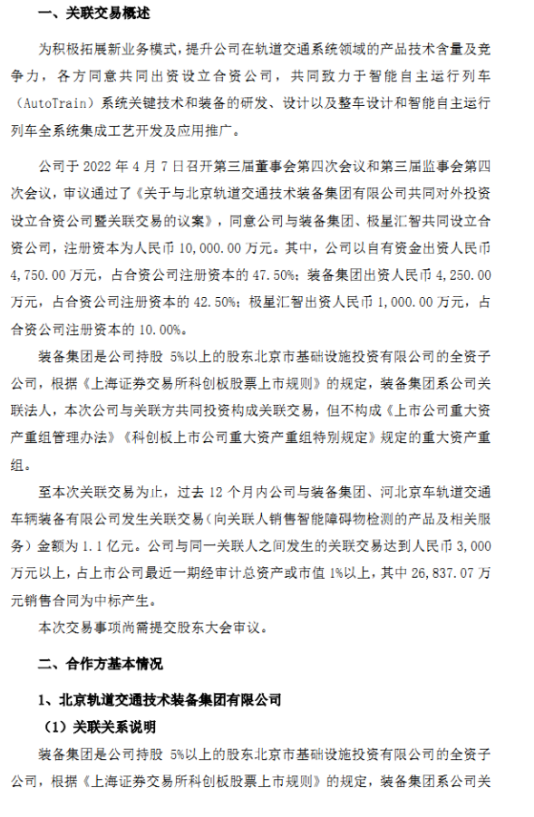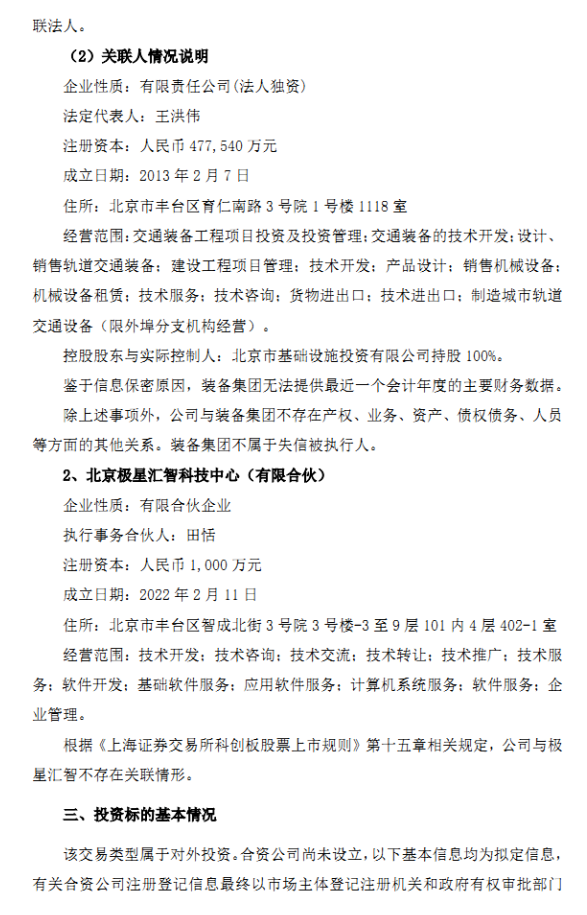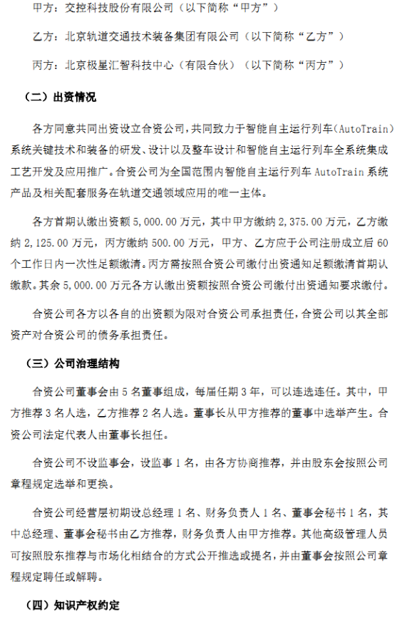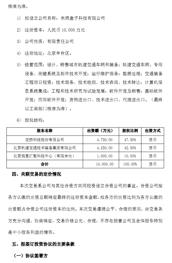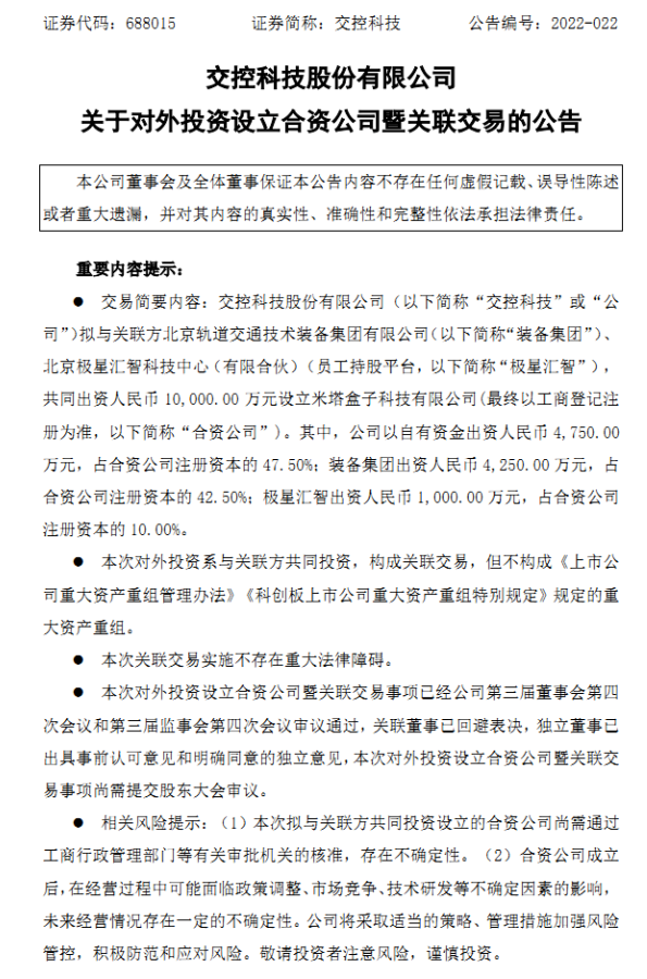 交控科技公告稱為積極拓展新業(yè)務(wù)模式,提升公司在軌道交通系統(tǒng)領(lǐng)域的產(chǎn)品技術(shù)含量及競(jìng)爭(zhēng)力,擬與關(guān)聯(lián)方北京軌道交通技術(shù)裝備集團(tuán)有限公司(以下簡(jiǎn)稱“裝備集團(tuán)”)、北京極星匯智科技中心(有限合伙)(員工持股平臺(tái),以下簡(jiǎn)稱“極星匯智”),共同出資人民幣 10,000.00 萬(wàn)元設(shè)立米塔盒子科技有限公司(最終以工商登記注冊(cè)為準(zhǔn),以下簡(jiǎn)稱“合資公司”)。其中,交控公司以自有資金出資人民幣 4,750.00萬(wàn)元,占合資公司注冊(cè)資本的 47.50%;裝備集團(tuán)出資人民幣 4,250.00 萬(wàn)元,占合資公司注冊(cè)資本的 42.50%;極星匯智出資人民幣 1,000.00 萬(wàn)元,占合資公司注冊(cè)資本的 10.00%。