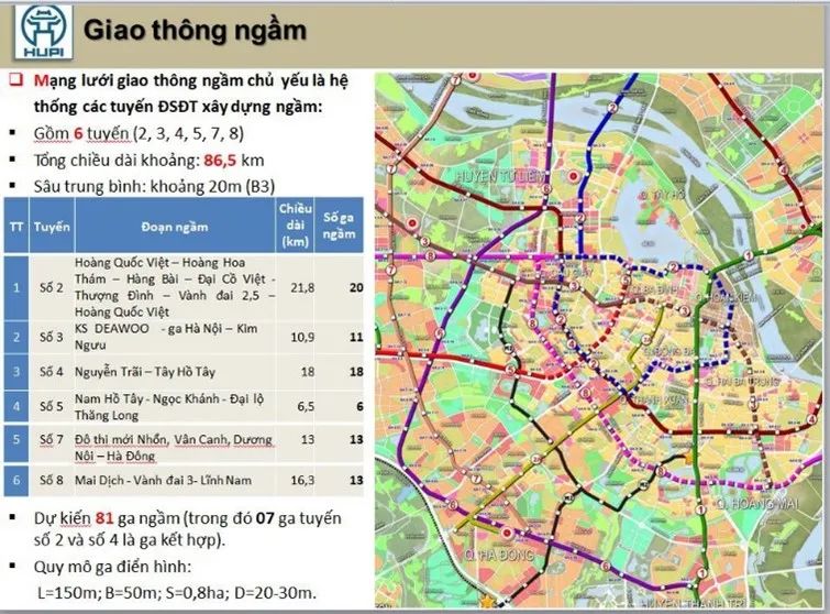 河內(nèi)市建筑規(guī)劃院表示,地下交通網(wǎng)絡(luò)是重點(diǎn)項(xiàng)目之一,根據(jù)規(guī)劃,河內(nèi)市將建設(shè)6條地鐵線路以及81個(gè)車站,6條線路建成后,總長度約為86.5公里。