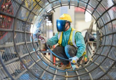 5月17日,建設者在包銀高鐵跨海勒太斯溝特大橋首根樁基施工現場進行焊接作業。