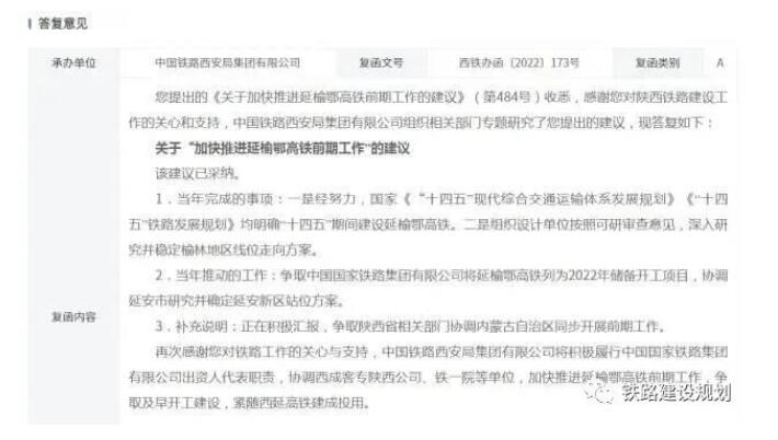 近日,鐵路西安局答復(fù)了《關(guān)于“加快推進(jìn)延榆鄂高鐵前期工作”的建議》,答復(fù)內(nèi)容如下:該建議已采納。
