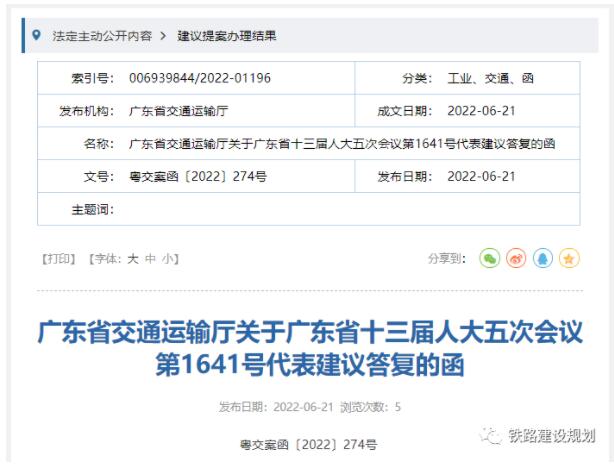 您提出的《關于加快推動廣湛高鐵項目廣鐵代建段及機場段建設工作的建議》(第1641號)收悉。經會同省發展改革委、佛山市政府、省鐵投集團、鐵路廣州局集團研究,現答復如下: