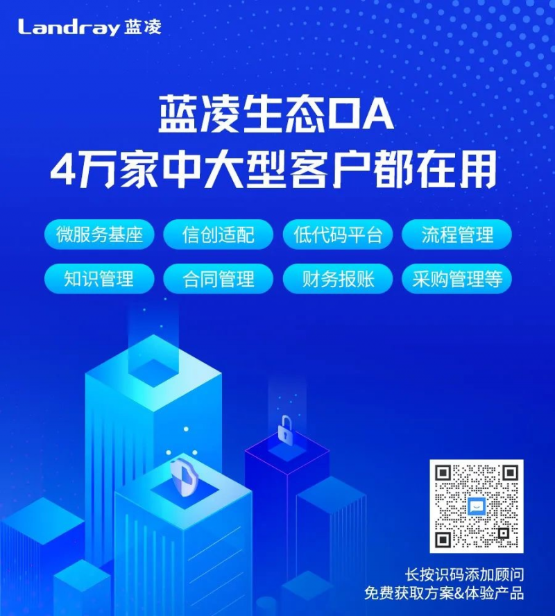 網頁搜索“藍凌官網”“藍凌MK-PaaS”,或添加藍凌顧問微信“landray888”或微信息公眾號“藍凌生態OA”,了解更多產品與案例詳情!