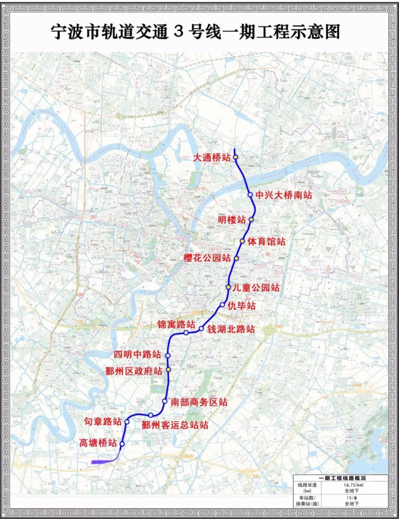 寧波市軌道交通3號線一期工程為南北向骨干線。主要經(jīng)過鄞州新城區(qū)、中興路,下穿甬江后止于江北區(qū)莊橋機場前,線路全長約16.73公里,設站15座。