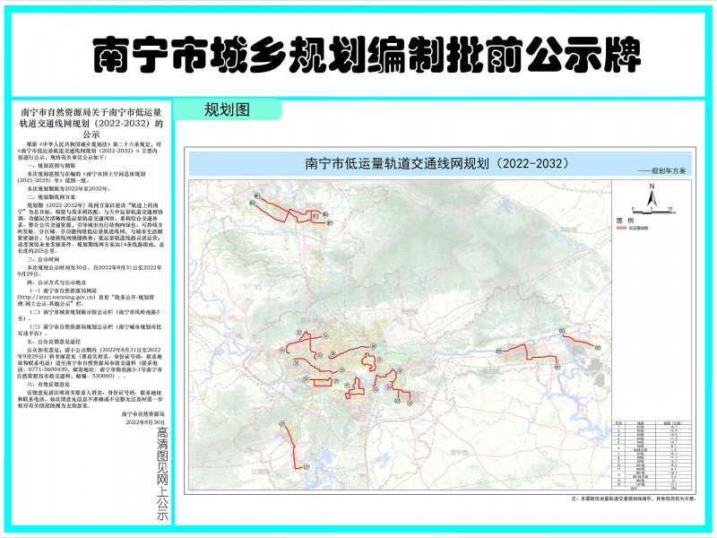 根據《中華人民共和國城鄉規劃法》第二十六條規定,對《南寧市低運量軌道交通線網規劃(2022-2032)》主要內容進行公示,現將有關事宜公示如下: