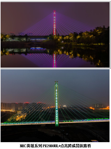 跨成昆鐵路橋光影秀由10臺NEC英雄系列雙色激光工程投影機PX2000UL+傾力點亮,以塔柱為幕,映出輝煌奪目的璀璨光影,為成都市民增添夜幕下的一抹迷人亮色。