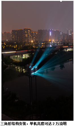 面對橋面以上高80米的獨塔斜拉橋的光影亮化工程,保證畫面亮度一致性是首要解決的難題。這不僅對投影機自身的硬件參數有著非常高的要求,還對安裝調試提出了巨大的挑戰。為實現光路的全覆蓋,并解決因橋體建筑傾斜角度過大而導致的畫面變形等一系列問題,經過縝密的測算,10臺PX2000UL+將主塔投影區域做拆分,劃為3大部分。底部由4臺投影機進行豎向融合,腰部以及頂端分別是6臺投影機,兩兩一組做豎向疊加融合。同時,為了縮小投影光路的傾斜角度,10臺英雄系列投影機被放置于12米高臺上,并通過投影機放置角度的精準調整,以4+4+2的方式呈三角形安裝,保障光影效果的同時,投影機也可持續穩定運行。