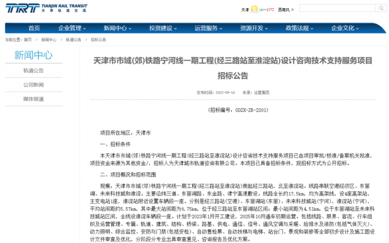 日前,天津軌道交通集團網站發布《天津市市域(郊)鐵路寧河線一期工程(經三路站至淮淀站)設計咨詢技術支持服務項目招標公告》。公告披露了市域(郊)鐵路寧河線一期工程的線路走線、設站情況及開工時間和計劃通車時間。