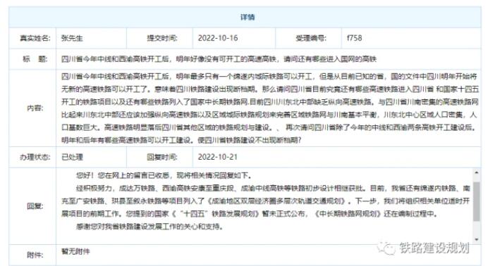 10月21日,四川省發改委鐵路和機場建設綜合處答復了網友關于四川省鐵路規劃建設的留言,詳情如下: